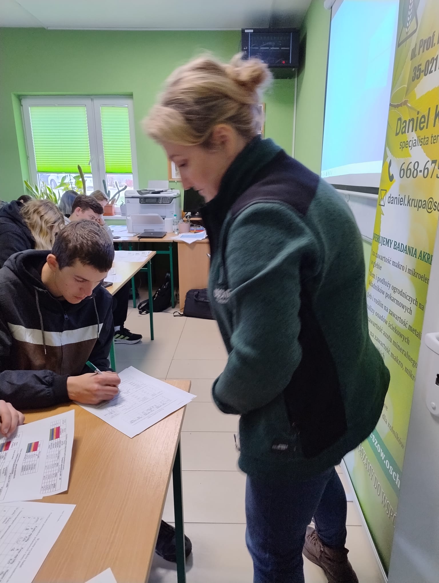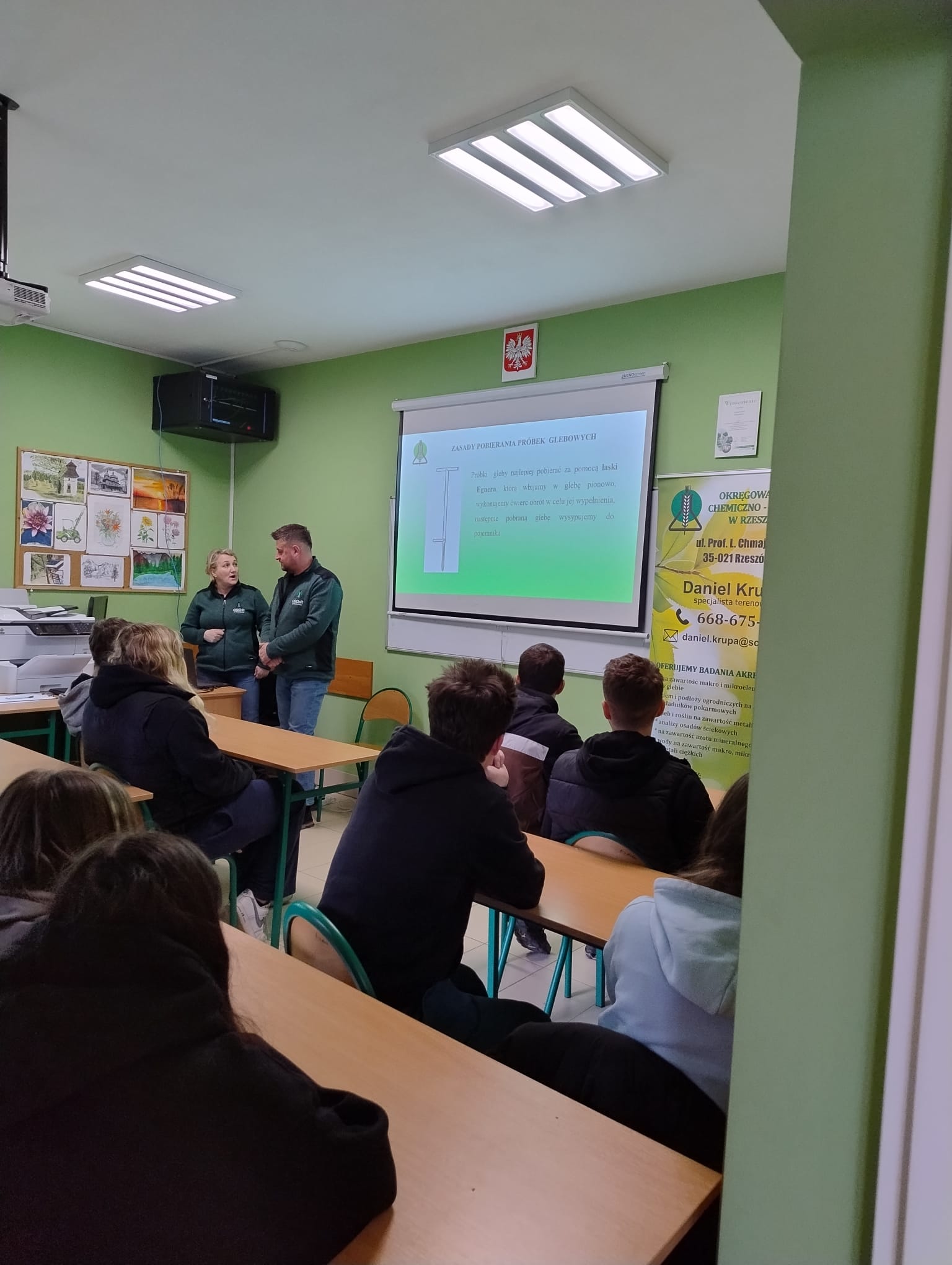 W październiku 2025 r. pracownicy stacji przeprowadzili podobne zajęcia z uczniami klas: 1, 2, 3 i 4 technikum architektury krajobrazu. Były to zajęcia w terenie – pobieranie próbek gleby na jednym z pól ornych należących do ZSCKR w Nowosielcach i przygotowanie ich do analizy pod kątem zawartości makro- i mikroelementów. W dniu 10 kwietnia 2026 r. ci sami pracownicy stacji przedstawili uczniom tych klas wyniki analizy pobranych w 2025 r. próbek glebowych oraz przypomnieli zasady pobierania próbek glebowych; w tych zajęciach uczestniczyli również uczniowie klasy 2 i 3 technikum rolniczego.